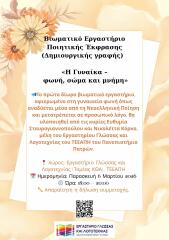 Αναλυτική περιγραφή : Ένα δίωρο βιωματικό Εργαστήριο αφιερωμένο στη γυναικεία φωνή, όπως αναδύεται μέσα από τη Νεοελληνική Ποίηση και μετατρέπεται σε προσωπικό λόγο, θα υλοποιηθεί από την κα Ευθυμία Σταυρογιαννοπούλου και την κα Νικολέττα Κόρκα στο Εργαστήριο Γλώσσας και Λογοτεχνίας. Μέσα από τους στίχους του Γιάννη Ρίτσου, του Οδυσσέα Ελύτη, της Μαρίας Πολυδούρη, της Κατερίνας Αγγελάκη-Ρουκ και της Κατερίνας Γώγου, θα ταξιδέψουμε στη θάλασσα της ποίησης και θα νιώσουμε τις λέξεις που μιλούν για μνήμη, επιθυμία, αγώνα, τρυφερότητα. Στη συνέχεια θα προχωρήσουμε στη (συγ)γραφή των δικών μας ποιημάτων. Η ποίηση δεν αποτελεί προνόμιο των ειδικών αλλά ευκαιρία έκφρασης κάθε ανθρώπου που ενεργοποιεί τη βιωματική του σχέση με τη γλώσσα. Η γραφή λειτουργεί ως πράξη αυτογνωσίας, είναι τρόπος νοηματοδότησης εμπειριών αλλά και χώρος ασφαλούς έκφρασης. Λόγω του βιωματικού χαρακτήρα του Εργαστηρίου, ο αριθμός των θέσεων είναι περιορισμένος (15 άτομα). Στην περίπτωση κάλυψης του αριθμού των συμμετεχόντων, θα υλοποιηθεί επαναληπτικό και θα ανακοινωθεί εγκαίρως η ημερομηνία. Δήλωση συμμετοχής: https://docs.google.com/forms/d/e/1FAIpQLSe9Vzo5uT3uJl5mnCq-dowtT-12a5erm4FA7pVgfzWWMUn6yw/viewform?usp=header